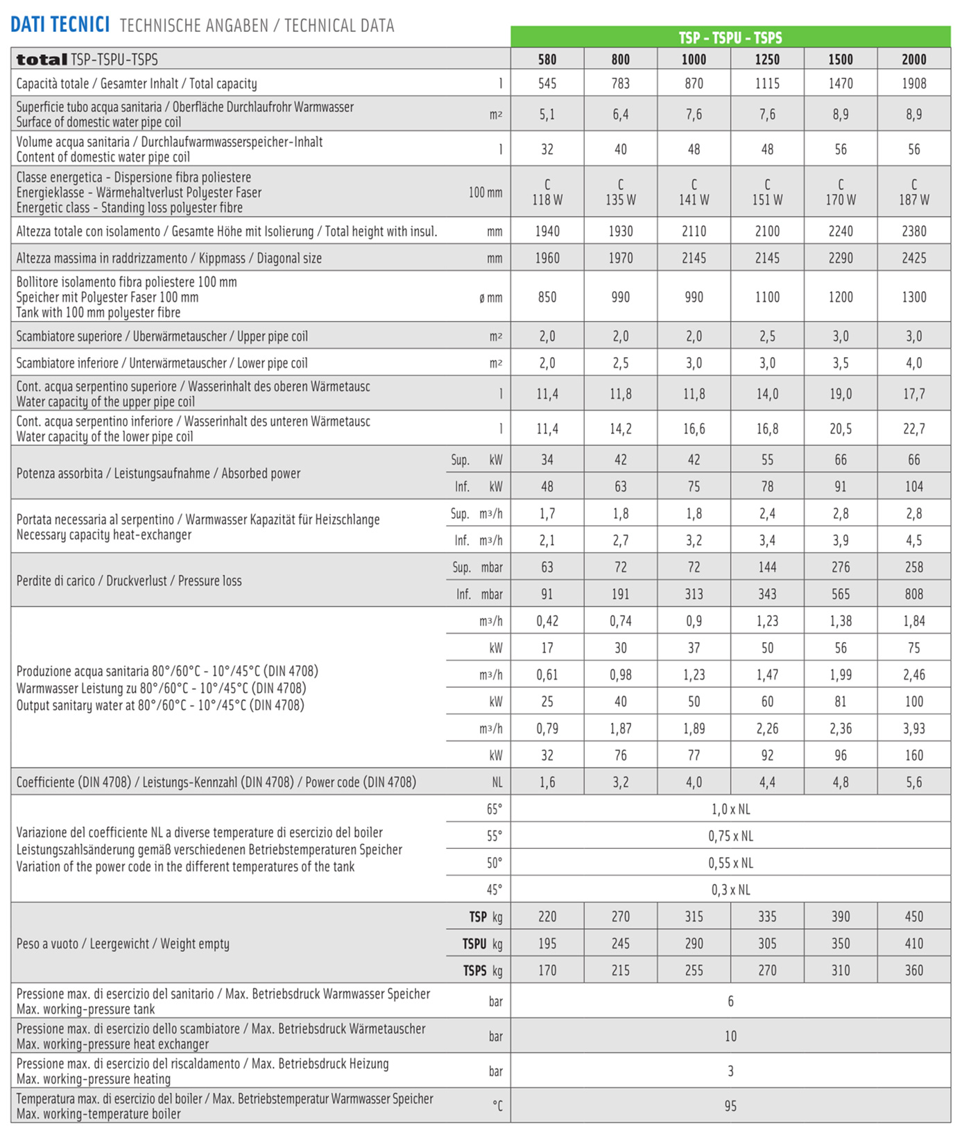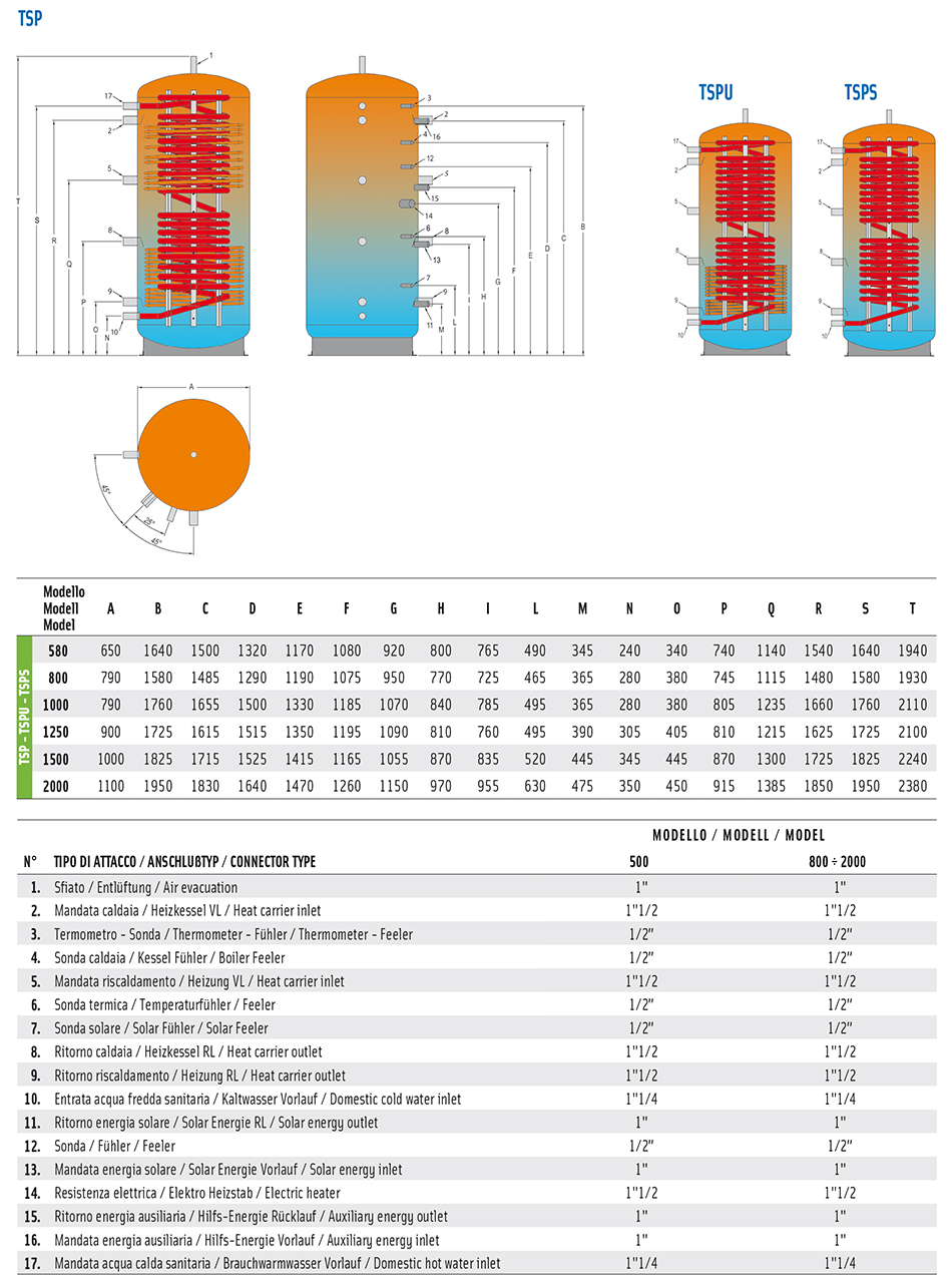 TSP Accumulo acqua riscaldamento con scambiatori a serpentino per solare e tubo a spirale corrugato in acciaio inox AISI 316L per produzione di acqua sanitaria.